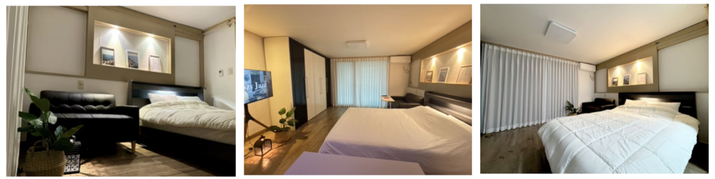 침대와 생활 공간이 여유 있게 이어진 구조입니다.